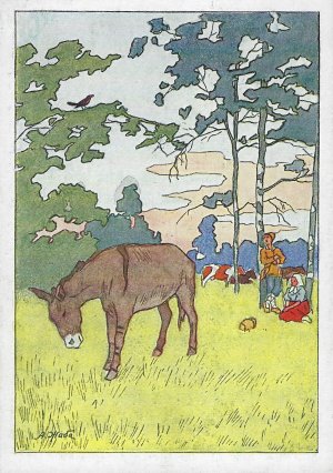 1944 Colored postcard representing “The Ass and the Nightingale” by Ivan Krylov. Artist: A. Zhaba. Circulation of 5000. Leningrad. €5 from Bartko-Reher, Berlin, April, ’21.