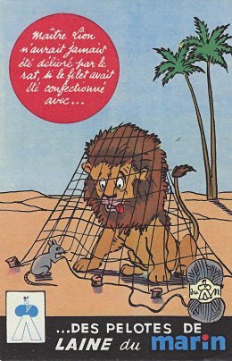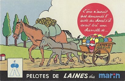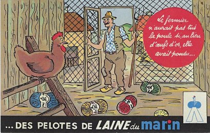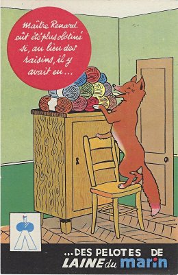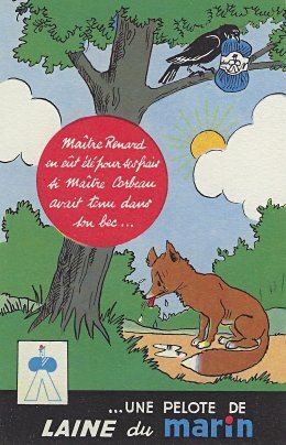 1935? Laines du Marin ("Sailor Wool"). Complete set of twelve colored postcards using La Fontaine's fables to advertise this brand of wool. $100 from Bertrand Cocq, Calonne Ricouart, France, Sept., '20. Duplicate of TH for €5 from Akpool, Berlin, June, '20.