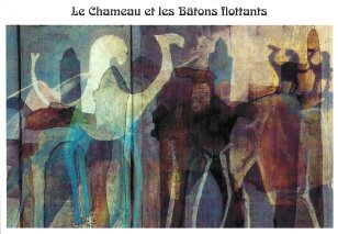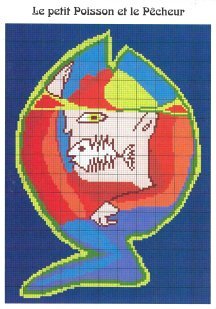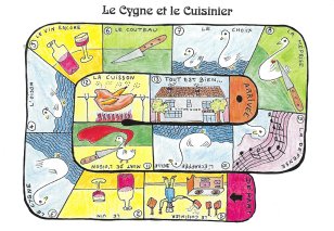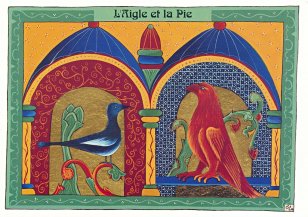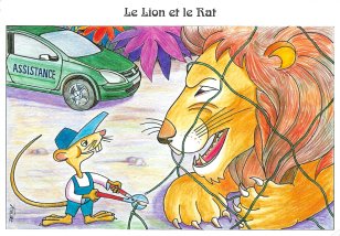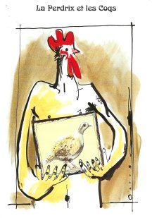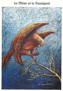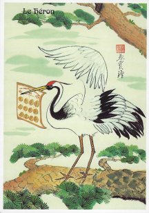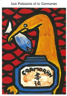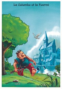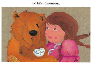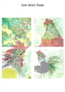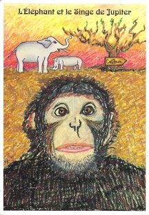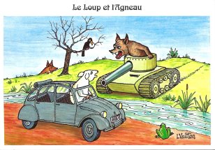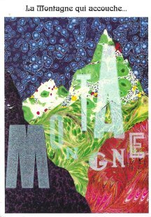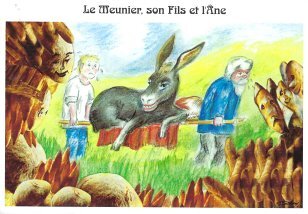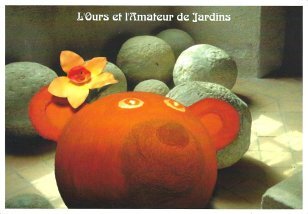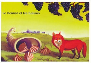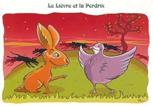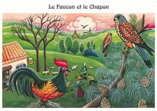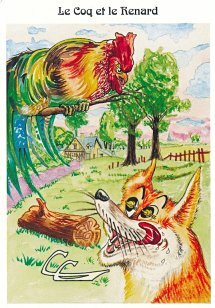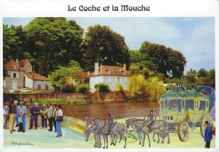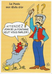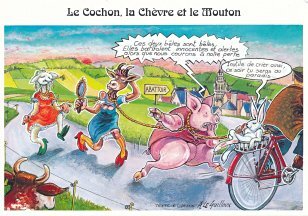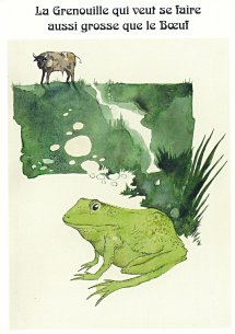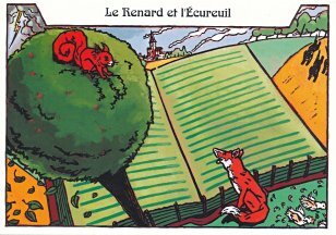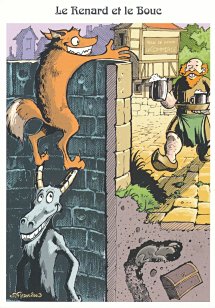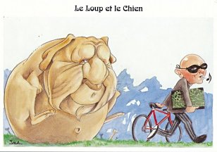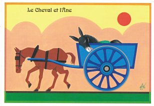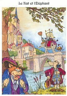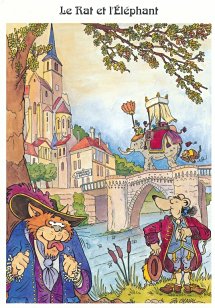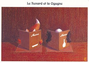 These cards exhibit lively artistry. They are marked by a common orthography in presenting the fable title on the image side and a common format on the message side. Montmorillon is known as a book town and describes itself on the message side of the cards as "Cité de l'Écrit et des Métiers du Livre." One of the liveliest cards, UP by Claude Coudray, is the title card for a set of black-and-white cards found earlier from the wife of the artist at a card fair in Paris in Jan., '05. "The Pig, Goat and Lamb" (#37) by André le Guilloux I had also found as part of a group purchased from the artist at the same card fair. I list it both here and there. This show was a wonderful outpouring of imagination directed to La Fontaine's fables! Among the highlights of this group, I point to FS (#7), for which both animals have their heads buried in menus! In "Fox and Goat" (#11), both animals wait for service from a waiter bringing bear and food! In #18, the horse uses a cart to carry the ass and his load. - Date