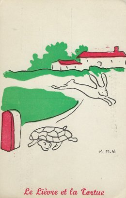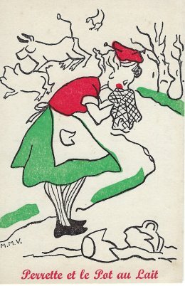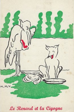 The artistry in these cards is surprisingly similar to that in the series done for the “Semaine Nationale de l’Enfance.” The verso of each card has a pointed remark to the reader drawn from the fable and the campaign. For MM it is “Would you have bought Perrette a new pot?” and for FS “Do not fool your children if you want to keep their trust.” I have found one other card on the web and hope to add it to the series. Perhaps Bertrand can find me the rest of the series, however large it may be! - Date