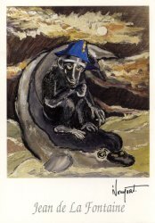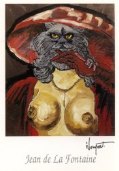 This is some of the strongest visual work I have seen in a long time. Nongort brings out the scary underside, I believe, of several of La Fontaine's fables. His "La Cigale et la Fourmi," for example -- which appears on what seems to be his own website -- shows a dancing woman in the foreground while a burdened worker walks off into the background. Would a viewer of this card, without seeing its title, immediately associate it with the fable? Again, Nongort's "The Cat Transformed into a Woman," accents her sexuality but gives her a sinister black catface with yellow eyes. Stirring stuff! I am so glad to have found these and sorry that I cannot find out more about the artist or the series. - Date