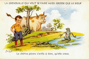 - "La Grenouille qui veut se faire aussi grosse que le boeuf": A boy and an ox watch as a frog on a lilly pod explodes. The bottom of the card quotes LaFontaine's lines 9-10: "La chétive pécore s'enfla si bien, qu' elle creva."