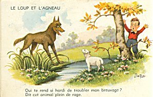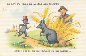 - 1940? Six different French postcards with colored picture on one side and room for a message and address on the other. Just over 3½" x 5½". The visual works are signed apparently by "Jim Patt." A line or two of La Fontaine appears under the picture of each card. Imprimé en France. Paris: M.D. $10 for OF at Foster City, Feb., '97. 40 Francs each for the similar two from Annick Tilly at the Clignancourt flea market, August, '99. 40 Francs for the presumably earlier version of MM with bold print from P. Bresch, Clignancourt, August, '01. €5 for TMCM from Dominique Chapelon, Yronde et Buron, at the Paris Post Card Exhibition, Jan., '05. €5 each for FS and TH at the Paris Post Card Exhibition, Jan., '05. Extra copy of TH for €4 from Akpool, Feb., '19. Extra copy of FC on thinner paper and without postcard formatting for €5 from Albert van den Bosch, Antwerp, June, '23.