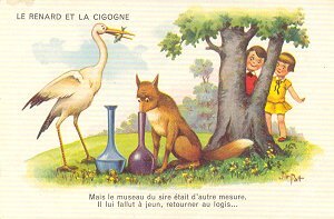 - "Le Renard et la Cigogne ": This card is printed on heavy stock. The message side has "Fabrication Française" instead of "Imprimé en France" and adds "2603." Again, what are human beings doing looking over the scene of the meeting of fox and stork? In this case, the ever-present children are hiding behind a tree.