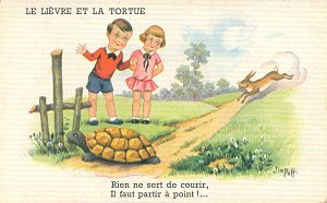 "Le Rat de Ville et le Rat des Champs": This card may have been cropped slightly. It seems smaller than the others in the series but is otherwise identical. What is the human being doing looking over the scene of their meeting in the country? - "Le Lièvre et la Tortue": Patt's particular contribution to this scene seems to be the presence of a boy and a girl, both apparently surprised by the results. "Imprimé en France." Never used. Again, this card is smaller than the others.