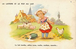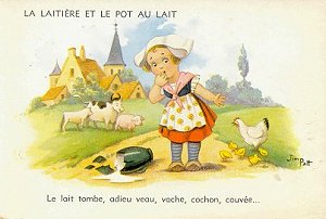 - "La Laitière et le pot au lait": A very young girl holds a surprised hand to her mouth after she has let her pot not only fall but also break. Chicks, rooster, and other dreamed-of animals are arranged around the scene.