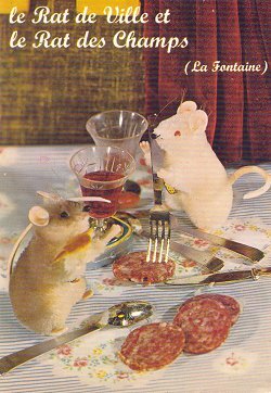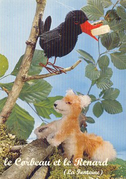 - FC (#12). €3 from Témoignage d'Images, Paris, at the Paris Post Card Exhibition, Jan., '05. The bill of the crow in this picture seems odd. Has it been forced into an awkward position so that it can hold the cheese? The verso of this card follows the format of others in the series but does not mention "Studio J.M. Piettre."