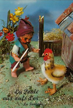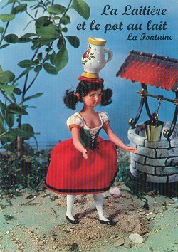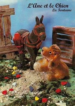 1970? Fables de La Fontaine. Eight cards of La Fontaine's fables with photographed scenes of plush animals and dolls. Numbered among a set of 114. Studio J.M. Piettre. Imprimé en France.
