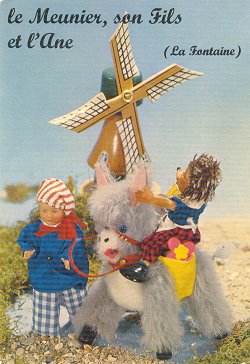 The photographs show Steiff-like stuffed animals and dolls engaged in the scene. All three Crucy cards contain messages from Gentilly (one is dated in 1975) written in the same hand and signed with the same name (Camard?). For me the effort to be cute costs these scenes heavily. Perhaps the most intriguing shows the two mice of TMCM dealing with wine and sausage. - MSA (#13) for €3 from Gérard Crucy, Yerres, at the Paris Post Card Exhibit, Jan., '05. Is that a hedgehog who is acting as the son of the miller?