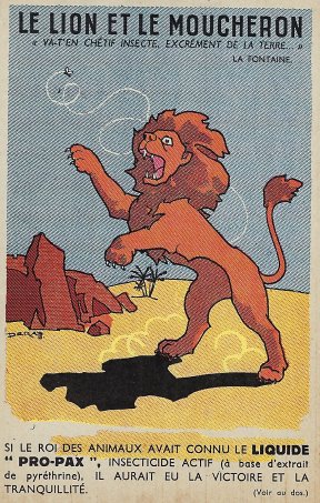 1950? Two postcards advertising Pro-Pax Insecticide. "The Lion and the Gnat" and "The Gardener and the Bear." €9.50 each from Gil Derudet, Saint Cloud, France, through Ebay, April, '22.