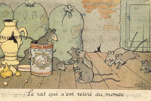 1905? Benjamin Rabier, "Le Rat qui s'est retiré du monde." Chocolate Lombart, Paris. €12 from Les Larmes d'Éros, Éditions Astarté at Paris Post Card Exhibition, Jan., '05.