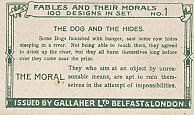 - 1922 "Thin Numerals." The number in the series here appears in large, thin print within the banner at the upper right. The crosslike form in the upper left corner touches the outer line of the frame. The typesetting of the fable text in this series is that of the 1912 series, except for the change in placement of the card number. #43 verso here has "The Field of Threasure." Complete set for £70 from Murray Cards International, Cecil Court, London, July, '99. Extra copies of #4, #5, #6, #7, #8, #9, #13, #15, #28, #30, #32, #36, #40, #45, #52, #54, #70, #85, #96, and #99. Extra set of 100 for £12 from an unknown source. Partial set of 49 extras for $15 from John Cole, Kent, UK, through eBay, August, '10.