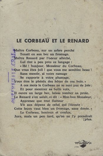 A little research suggests that Volumetrix expanded to include a Paris location and that they produced many cards for collection. The two different fable series found on the web seem to include titles on the illustration side of their cards. There is no such title here. It is hard to know whether this is a trade card or simply a “fable card.” With no evidence that it was used to sell a product, I will include it with fable cards. There is a stamped set of purpose letters at a 90 degree angle to the fable text on the verso. - Date