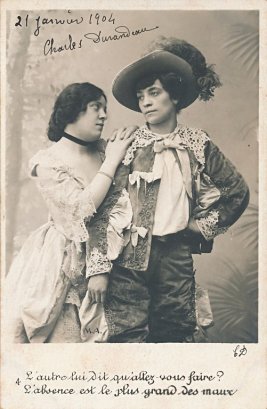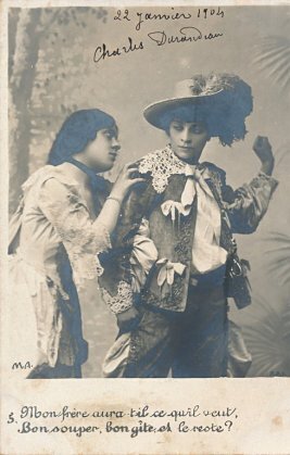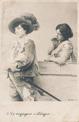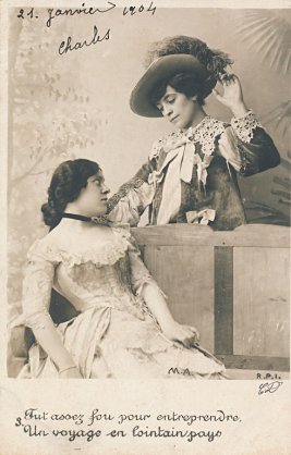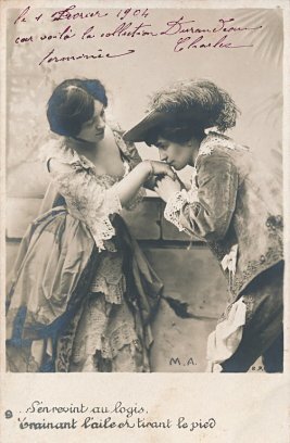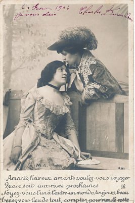 Many levels of interpretation are at play in the presentation of this fable. La Fontaine writes this story about two male doves, one of whom has wanderlust and, against the urgings of his dear friend, goes off to experience the world so that, as he sees it, he can return and relate to his dear friend his adventures abroad. The trip turns out to be uncomfortable and dangerous, and the traveler returns wounded. The two are happy to be reunited. La Fontaine himself reflects then, at the age of 68, wondering whether he will ever experience the flames of passion that he did earlier. His last line is "Have I passed the time for loving?" That is, he himself, seems to see a deeply romantic and even erotic theme in the story. Interpreters of La Fontaine have been quick, in my experience, to portray the story as about two lovers. Here we are presented with a male friend who needs to travel, to the pain of his stay-at-home female friend. (Is the male traveler being portrayed here actually by a female?) The set of ten cards tracks the interaction with sensitivity. Notice the eighth card, where the solitary friend waits and hopes for the return of her dear friend. The cards were all posted to the same party during January and February, 1904. All but two are signed by Charles Durandeau. The cursive writing of La Fontaine's phrases on each card is curious. - Date