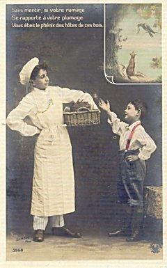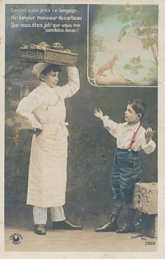 The human story is utterly consistent with the fable, as a child sees bakery in the tray on the baker's head and flatters him to get some of the bakery. As in the "Croissant" version of TH, there is a portion of each card's picture given to a colored rendition of the original fable, the first of them announcing the title. These three cards present the first nine lines of La Fontaine's fable, and thus I have labelled them Cards #1 through #3 of the set. Are these cards hand-tinted? The coloring of FC in the upper right of Card #3 is particularly nice. - Date