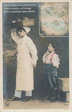 1910? Three colored photographic postcards from a set (of 6?) using children to portray La Fontaine's FC. Sozerac 3968. Paris: Croissant. Card #3 for $9.99 from Stefano Nels, Columbia, SC, through eBay, July, '05. Cards #1 and #2 for $20 from Bertrand Cocq, Calonne Ricouart, France, Sept., '18.