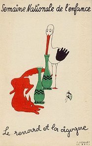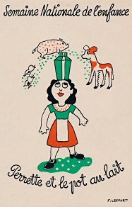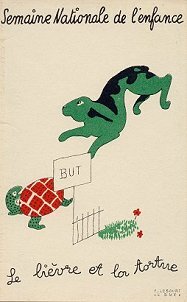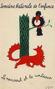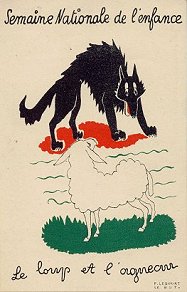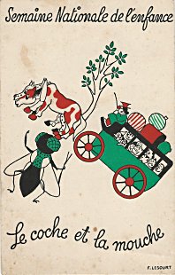 1965? "Semaine Nationale de l'enfance." Nine different French postcards (plus extras of FC and "Animals Sick with the Plague") with black-green-and-red colored pictures of La Fontaine's fables on one side and room for a message and address on the other. Just over 3½" x 5½". The visual works are signed "F. LeSourt/Le But." (MSA, "Animals in the Plague," "The Coach and the Fly," and MM are signed by only the former.) "Semaine Nationale de l'enfance" appears above each image and the title of the fable below it. Comité National de l'Enfance, Paris. Paris: S.F.E.I. $17.50 for three (FC, FS, and TH) from Alexandre Przopior, April, '00. 40 Francs for WL from Annick Tilly, Clignancourt, August, '01. 105 Francs for "Les deux taureaux et la grenouille," MSA, and an extra copy of FC from P. Bresch, Clignancourt, August, '01. Two more cards for €5 apiece from ABC de la C.P.A., Lyon, at the Paris Post Card Exhibition, Jan., '05. Three more cards for €5 apiece from Serge Ferry at the Paris Post Card Exhibition, Jan., '05 and two including TT for €4 apiece from Brie Comte Robert at the same exhibition. One last card for €5 at St. Ouen, August, '13. "Coach and Fly" and "Animals Sick of the Plague" as a gift of Bertrand Cocq, Calonne-Ricouart, August, '15. Further copies of WL, TT, and FC from Dominique Delage, Saint-Ouen, August, '15. The final missing card in the series, MM, for $7 from Bertrand Cocq, Calonne Ricouart, France, Sept., '18. Five extras for €15 from Recto-Verso, Strasbourg, July, '19.