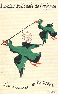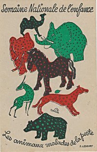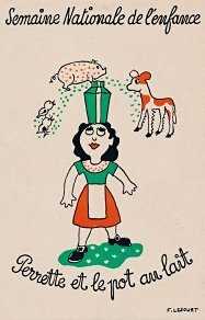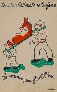 - Comité National de l'Enfance, Paris. Paris: S.F.E.I. $17.50 for three (FC, FS, and TH) from Alexandre Przopior, April, '00. 40 Francs for WL from Annick Tilly, Clignancourt, August, '01. 105 Francs for "Les deux taureaux et la grenouille," MSA, and an extra copy of FC from P. Bresch, Clignancourt, August, '01. Two more cards for €5 apiece from ABC de la C.P.A., Lyon, at the Paris Post Card Exhibition, Jan., '05. Three more cards for €5 apiece from Serge Ferry at the Paris Post Card Exhibition, Jan., '05 and two including TT for €4 apiece from Brie Comte Robert at the same exhibition. One last card for €5 at St. Ouen, August, '13. "Coach and Fly" and "Animals Sick of the Plague" as a gift of Bertrand Cocq, Calonne-Ricouart, August, '15. Further copies of WL, TT, and FC from Dominique Delage, Saint-Ouen, August, '15. The final missing card in the series, MM, for $7 from Bertrand Cocq, Calonne Ricouart, France, Sept., '18. Five extras for €15 from Recto-Verso, Strasbourg, July, '19.