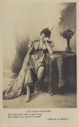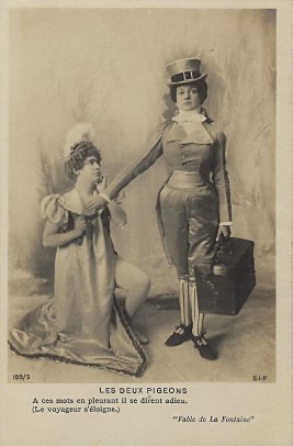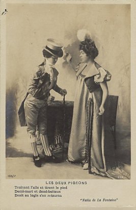 This is a remarkable set in several ways. This collection does not have many sets of eight cards. Six seems to have been the standard size, with a few including ten cards. At least some of the photographic series try to include the whole text of a fable. With this fable's long text, that is impossible. The editors here make a clever shift. What in the text is part of the stay-at-home's plea for the friend not to depart here becomes a solitary statement of concern while the friend is gone. Perhaps the most fascinating thing about this series has to do with its handling of gender. La Fontaine's text, as far as I can tell, speaks of male friends. French illustrators of the fable appear, at least to me, to have interpreted it frequently and even regularly in heterosexual and romantic terms, with a male leaving a female behind and returning to her. Here, to help complexify matters, a female plays the departing male, with little attempt to disguise her femininity. Hmmm….. The last seven cards were sent to an Yvonne Ronard. The first card has a cancelling date of 1905. By the way, this bird does come home as wounded and battered as I think the dove does in La Fontaine's fable! - Date