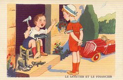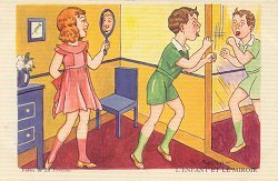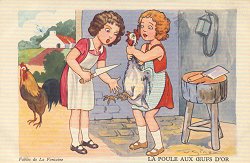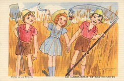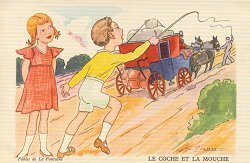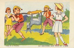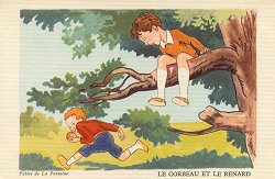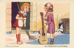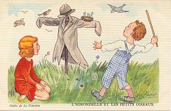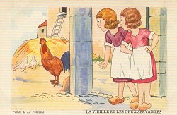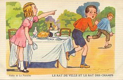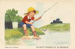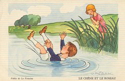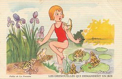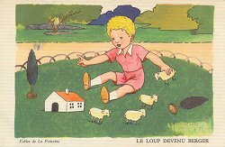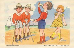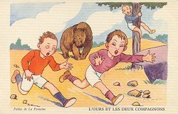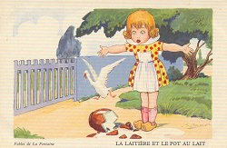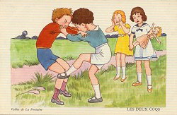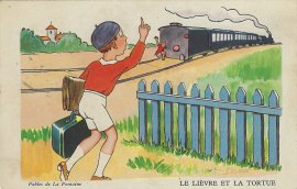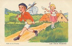 1950? Fables of La Fontaine. Twenty-three (out of a series apparently of twenty-four) full-color postcards displaying favorite La Fontaine fables, with young people playing appropriate human roles. V. Spahn signs the cards. Card #17 is missing. €62 for the set from Serge Ferry at the Paris Post Card Exhibition, Jan., '05. Extra copy of #12 from Suzanne Botti, Le Bono, at the Paris Post Card Exhibition, Jan., '05. Extra copy of FK for $9.99 from Gold-Coast, Brentwood, TN, Nov., '13. Extra copies of #7 and #15 for €1 apiece from Akpool, Berlin, August, '18. TH for €4 from collecman through Ebay, June, '22.