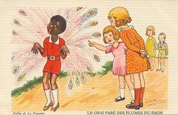 The text of the fable takes up most of the message-space on the verso of the cards. Under the picture is "Fables de la Fontaine" in Italics at he lower left and a block-print title at the lower right. The modes of translating the fables into children's life are fascinating here. The emphasis is not on simple "cuteness." The children can play the fable straight, as in "L'Huitre et les Plaideurs" and GGE. FC is thus about one child stealing a ball while another sits up a tree and watches his ball stolen. Or a child can assume an unpleasantly animalistic role, as when TMCM shows an imperious girl chasing two boys away from a table full of food. The picture opens up whole new categories of interpretation when "The Wolf Become a Shepherd" shows a child picking up play sheep on the lawn. Again, there are whole new interpretations at work when FK shows a girl in a bathing suit with a frog clinging to her shoulder. Is she queen of the frogs? A few cards perhaps hardly make sense. What does the boy falling into the water have to do with OR? The set hits a low point, I believe, when it offers a black male child wearing feathers as "Le Geai Paré des Plumes du Paon." Perhaps the cards are meant simply as fun and not to be interpreted at all. Card #15 adds a false number to its fable title: "XIV." All the cards here seem to have been sent or addressed to the same party--but never to have been mailed with a stamp. Finally getting #17, TH, in June of 2022 completes the set. - Date