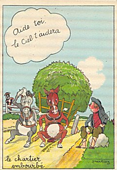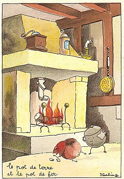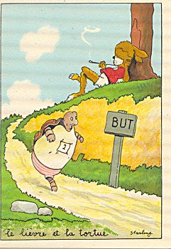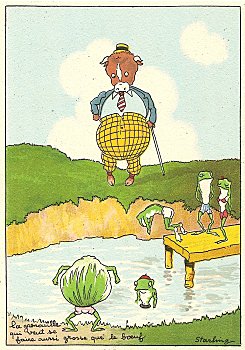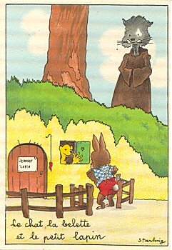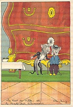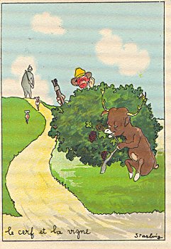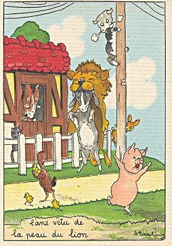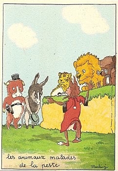 - €3 each from Collections N. et F. Murtin at Paris post card fair, Jan., '05. One other card, "L'Âne Vetu de la Peau de Lion," and extra copies of six cards for €4 each from Gérard Crucy, at the same Paris post card fair, Jan., '05. Extra copy of "Wolf versus Fox before Monkey" for € from bouquiniste Claire Leriche, Paris, June, '23.