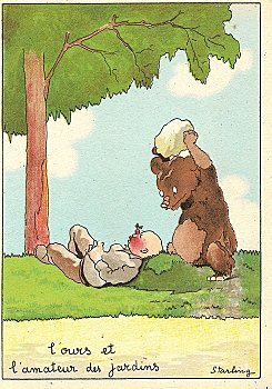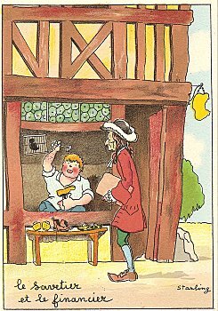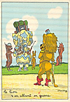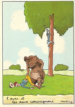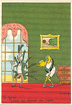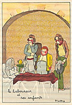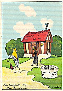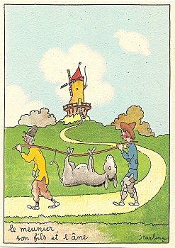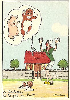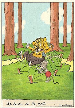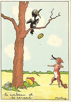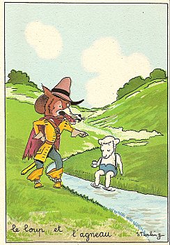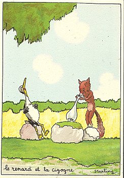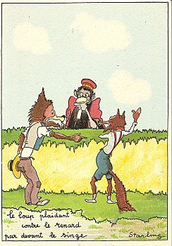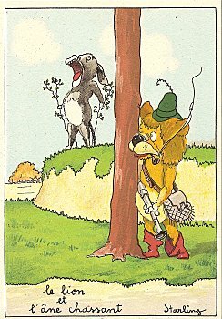 1947? Fables of La Fontaine. Nineteen full-color postcards displaying favorite La Fontaine fables, all with a "Starling" signature at the bottom. 4 1/8" x 5 7/8". Imprimé en France. Paris: M. Barré and J. Doyez. €3 each from Collections N. et F. Murtin at Paris post card fair, Jan., '05. One other card, "L'Âne Vetu de la Peau de Lion," and extra copies of six cards for €4 each from Gérard Crucy, at the same Paris post card fair, Jan., '05. Extra copy of "Wolf versus Fox before Monkey" for € from bouquiniste Claire Leriche, Paris, June, '23.