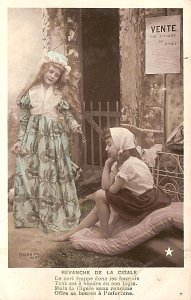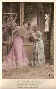 Series #3046 is five cards on the cicada's revenge on the niggardly ant. The story follows up on Series #3045, "La Cigale et la Fourmi." The cicada character is the same in all cards of both sets. Here the rejected cicada finds a fairy godmother who trains her musically. The cicada, now rich, returns to the ant, who has been thrown out of her home and needs to sell everything. The ant is the same actress as in the other set, and the venue is the same, except for the "For Sale" sign here. The gracious cicada takes no revenge but rather opens her purse for the unfortunate ant. There is extensive pink and green coloring of these black-and-white pictures. I wonder how that was done. - Date