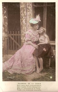 1905? Five photographic postcards presenting "Revanche de la Cigale," apparently a sequel to "La Cigale et la Fourmi," presumably after La Fontaine. VBC Série No. 3046. Stebbing Photographic Studios. All were sent to Mademoiselle Marie Louise Bruyère (chez ses Parents), Grande rue à St Genis, Laval, Rhône. At least one card is clearly dated 1907. $9.99 from Joachim Montbord, La Sauve, France, through eBay, March, '04.