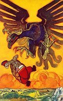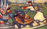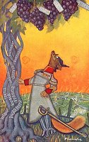 - 1915? Aesop's Fables Up To Date. Thirty unnumbered colored post cards, including English, Dutch, Italian, Spanish, and Portugese printings. There are six basic 1915? Aesop's Fables Up To Date. Thirty unnumbered colored post cards, including English, Dutch, Italian, Spanish, and Portugese printings. There are six basic pictures--or at least I have found that many so far. F. Sancha seems to sign each card. Fables are used here to satirize Germany. The fable texts on the message side appear in Dutch, Spanish, Italian, Portuguese, or English on individual cards; any words printed on the image side shift correspondingly. English cards are all marked "Raphael Tuck and Sons' 'Oilette' Postcard No. 8484." Copyright London. Printed in England. Raphael Tuck and Sons. One set in English came in its own frail original envelope: "German Aims, Shown up by the Celebrated Spanish Artist Francisco Sancha in Aesop's Fables Up -to-Date." $66 from Sue's Stuff, Huntington Beach, CA, Nov., '02. Spanish versions of FG and GGE for a total of $15 from marupostcards in Uruguay through Ebay, Jan., '21. The envelope for this "Oilette" Series 8484 claims that Oilette cards are "veritable miniature oil paintings." Click on any of the small images to see a fuller version and comments on each card in its several language versions.