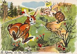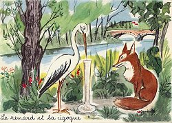 The pictures are done in a vivid and colorful style. A frantic rabbit tries to catch up to a turtle already near the "But" sign on a tree. The fox sneers at the stork preparing to enjoy food from a vase, with a river and bridge pictured in the background. Flowers, trees, and other countryside elements abound in each image. There is a cursive title under each picture. - Date