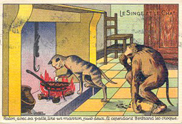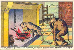 1930? Colored postcard presenting "Le Singe et le Chat." Artist's mark is "Wal." "Raton, avec sa patte tire un marron, puis deux,. Et cependant Bertrand les croque." €4 from Brie Comte Robert at the Paris Post Card Exhibition, Jan., '05.