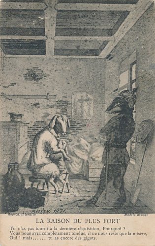 This is a fascinating card. The wolf is clearly dressed in a Prussian uniform. I believe the wolf is complaining that the sheep did not turn in any supplies at the last "requisition." She answers "you have completely shorn us. We have nothing left but misery." "Yes, but you still have children." This is a dark political statement! I believe Bertrand that this card is rare! - Date