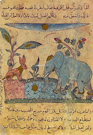 The scene very closely approximates "Fairuz with the King of the Elephants" on 42 of Esin Atil's Kalila wa Dimna (1981). No doubt the hare is fooling the elephant into believing that the moon in the water is speaking and asking the elephant tribe to leave her sacred waters alone. They had been killing the hares without even knowing it by walking on them. - Date