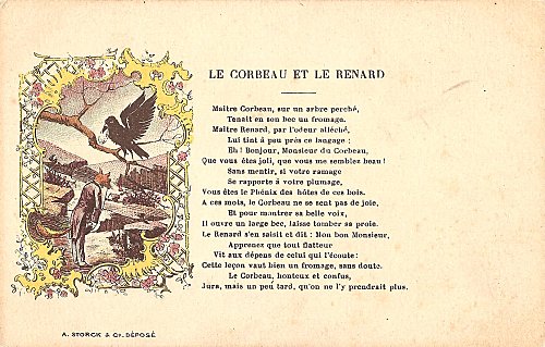 1920? Postcard presenting La Fontaine's FC text beside a colored illustration. A. Storck & Co. Deposé. 50 Francs from Annick Tilly, Clignancourt, July, '02.