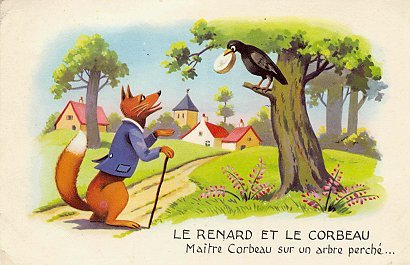 This card quotes the first line of La Fontaine's fable. It sketches a simple and colorful village in the background. Except for the identifying phrase above as to its origin, the back is blank. Does this card not seem very much in the style of Jim Patt's postcard of FC? - Date