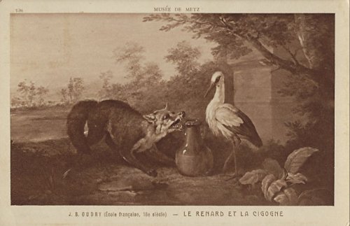 1912? J.B. Oudry, "Le Renard et la Cigogne.: Sepia-and-white photograph of FS painting. Musée de Metz. Metz: E. Prillot, Éditeur. $8 from Bertrand Cocq, Calonne Ricouart, France, Sept., '18.