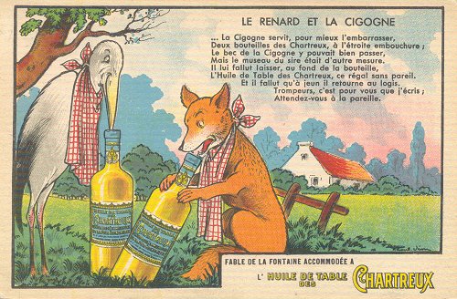 1920? Postcard presenting FS. "Fable de la Fontaine accommodée a l'Huile de Table des Chartreux." Artist Raoul Vion. €10 at Paris Post Card Exhibition, Jan., '05.