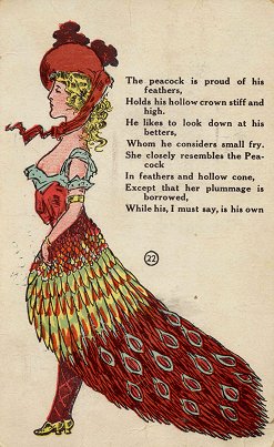 This card is from a series of which I saw some of the other members. It has "22" on it. Along with the multi-colored image of a woman who wears an outlandish skirt made of peacock feathers, there are eight lines of verse. The last four: "She closely resembles the Peacock/In feathers and hollow cone,/Except that her plummage is borrowed,/While his, I must say, is his own." (Did "plumage" have a double-m back then?) What we thus have is at least a lovely allusion to BF. The back has an address and a two-cent stamp. It was postmarked in 1908. - Date