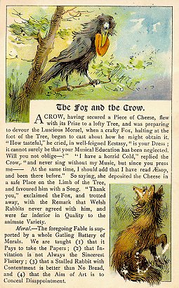 The fable starts in traditional fashion. The crow replies to the fox's flattering request by saying that she has a cold and never sings without her music. She also mentions that she has read Aesop, and she places the cheese in a safe place in the tree. The fox on leaving remarks that Welsh rabbits never agreed with him. There are four morals drawn, including "that Invitation is not Always the Sincerest Flattery" and "that the Aim of Art is to Conceal Disappointment." Nister's colored presentation of the crow is very good. - Date