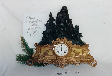 1997 Christmas postcard from the Reineke Fuchs Museum, Linden, Germany, with photograph of an 1890's clock, made in Paris, adorned by a statue of La Fontaine with fox and crow. Message from Friedrich von Fuchs to Rev. Gregory Carlson, S.J.