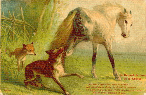 1920? "Le Renard, le Loup et le Cheval." 4 (?) Deposé. €4 at the Paris Post Card Exhibition, Jan., '04.