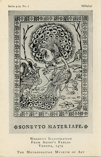 1930? "Sonetto Materiafe." Woodcut illustration from Aesop's Fables, Verona, 1479. Metropolitan Museum of Art. $3 from Charlie and Rich Heckroth, Tucson, AZ, through eBay, August, '10.
