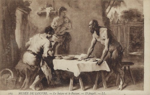1900? Black-and-white postcard with a photograph of D’Angeli’s “The Satyr and the Peasant.” “165 Musée du Louvre. LL.” $5 from Bertrand Cocq, Calonne-Ricouart, France, Sept., ’20.