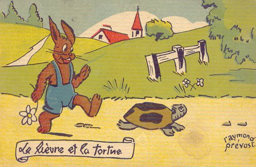 The hare walks behind the tortoise with a flower in his hand. Would this be the opening moment of the story? Strong, simple colors. The verso of this card has suffered, apparently from having been pasted into an album. - Date