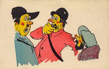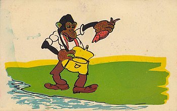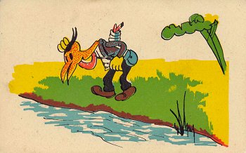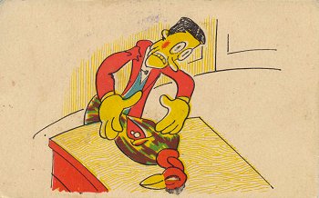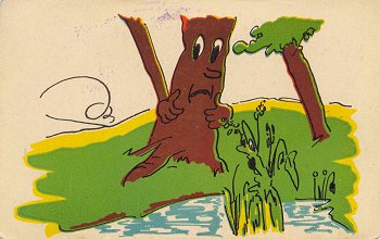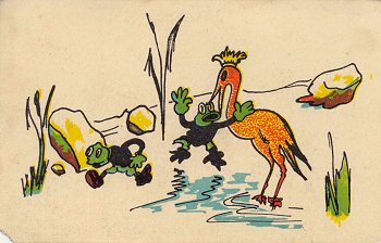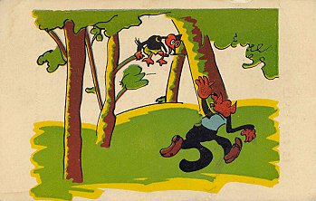 1950? 11 cards each with a simple cartoon illustration of a La Fontaine's fable on one side and the text of the fable on the other. 3" x 4¾". Apparently given as school prizes for attendance or punctuality. 10 Francs apiece from Helen Moncourt on the Quai de la Seine, May, '97.