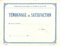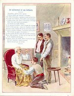 These large cards might seem in our culture to bring together two disparate functions, namely of the small picture-card and of the large certificate. The scenes here are "Le Laboureur et ses Enfants" and MM. The latter is drying her eyes with her apron. One of the two certificate formulas on the back fills in a "3" to help date these cards to the very early 30's. The picture side of these cards is identical with the picture-sides of the large trade cards I have listed under Arlatte/Printemps/Jacques. The more recent four cards have hand-written testimonials on the verso, not the printed citation of the earlier found cards. - Date