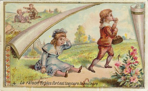 In style, this card seems like Liebig cards. Scrollwork on the upper left and far right reveals two different scenes of bullying by the stronger. Apparently the boy is making off with the girl's lunch. The verso features the text of La Fontaine's WL. - Date