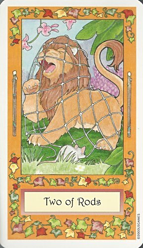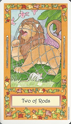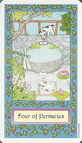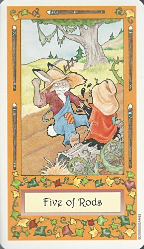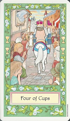 Four cards in this 78-card deck mixing fairy tales and tarot figures present fables: "Four of Pentacles" presents DS. "Two of Rods" presents LM. "Four of Cups" presents "The Emperor's Clothes." And "Five of Rods" presents "The Tarbaby." - Date