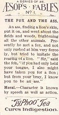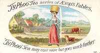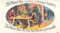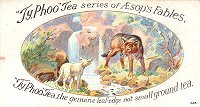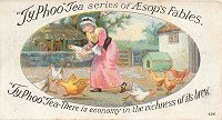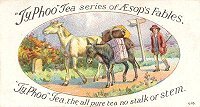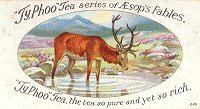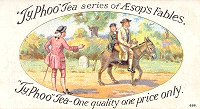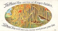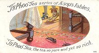 2 5/8" x 1 7/16". Excellent color in ovals with a different slogan for the tea under each oval, e.g. "TyPhoo" Tea goes just half as far again. The back has "A Series of 25," "Aesop's Fables," and a number on top; a title, fable, and moral in the center; and "TyPhoo" Tea Cures Indigestion at the bottom. In the illustration for "The Horse and Groom" (#4), there is good work to show how poorly fed this horse is. The artist takes a good perspective (knee-high looking down) for illustrating TMCM (#15). "The Fox and the Wolf" (#8) seems to me to be especially well done. Two illustrations leap out to me as taken from Bewick: MSA (#20) and MM (#25). Excellent condition. These cards are so beautiful that I show them here in almost their size. Click on any image to see it in larger-than-life size. - Date